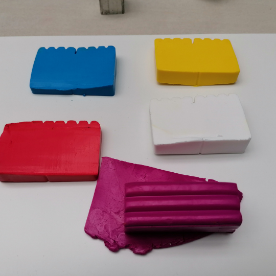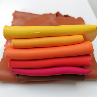 Ik vertrek van enkele primaire kleuren. Wit, geel, rood, magenta, blauw en ook een tikkeltje zwart indien nodig. Het is wat zoeken en testen tot ik de juiste kleuren heb.