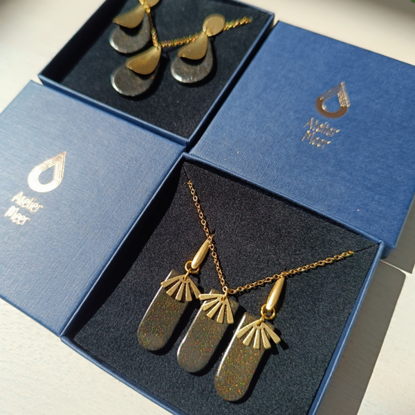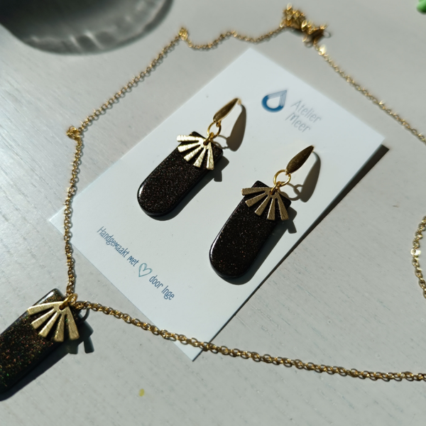 Zwarte bengelende oorbellen in polymeerklei met subtiel gouden glittertje. Goudkleurig bedeltje in messing om het extra feestelijk te maken.