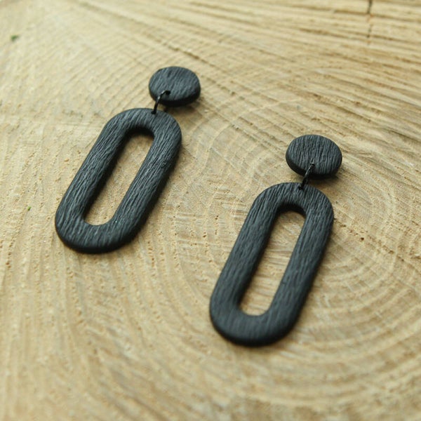 Langegerekte ovalen bengelende oorbellen in zwarte polymeerklei met streepjes reliëf
