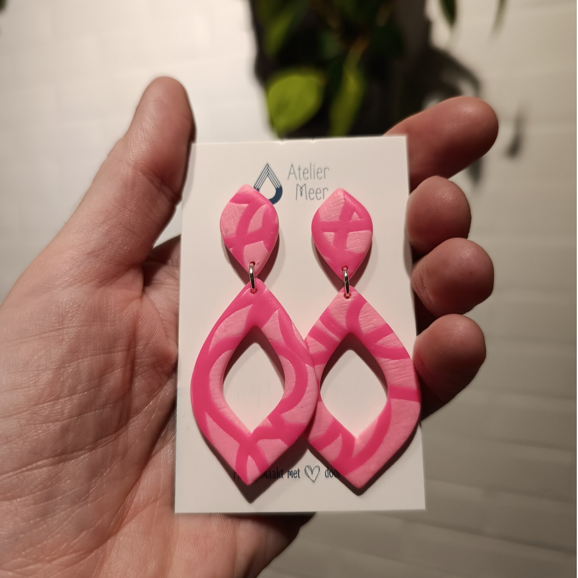 Elegante statement oorbellen die super licht zijn om te dragen en één van de toppers van Atelier Meer. Nu in licht fluoroze met fel fluoroze lijnen. Echte eye catchers.