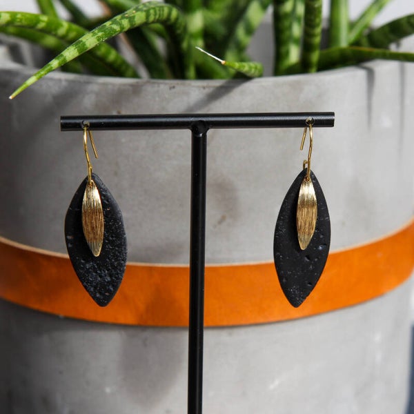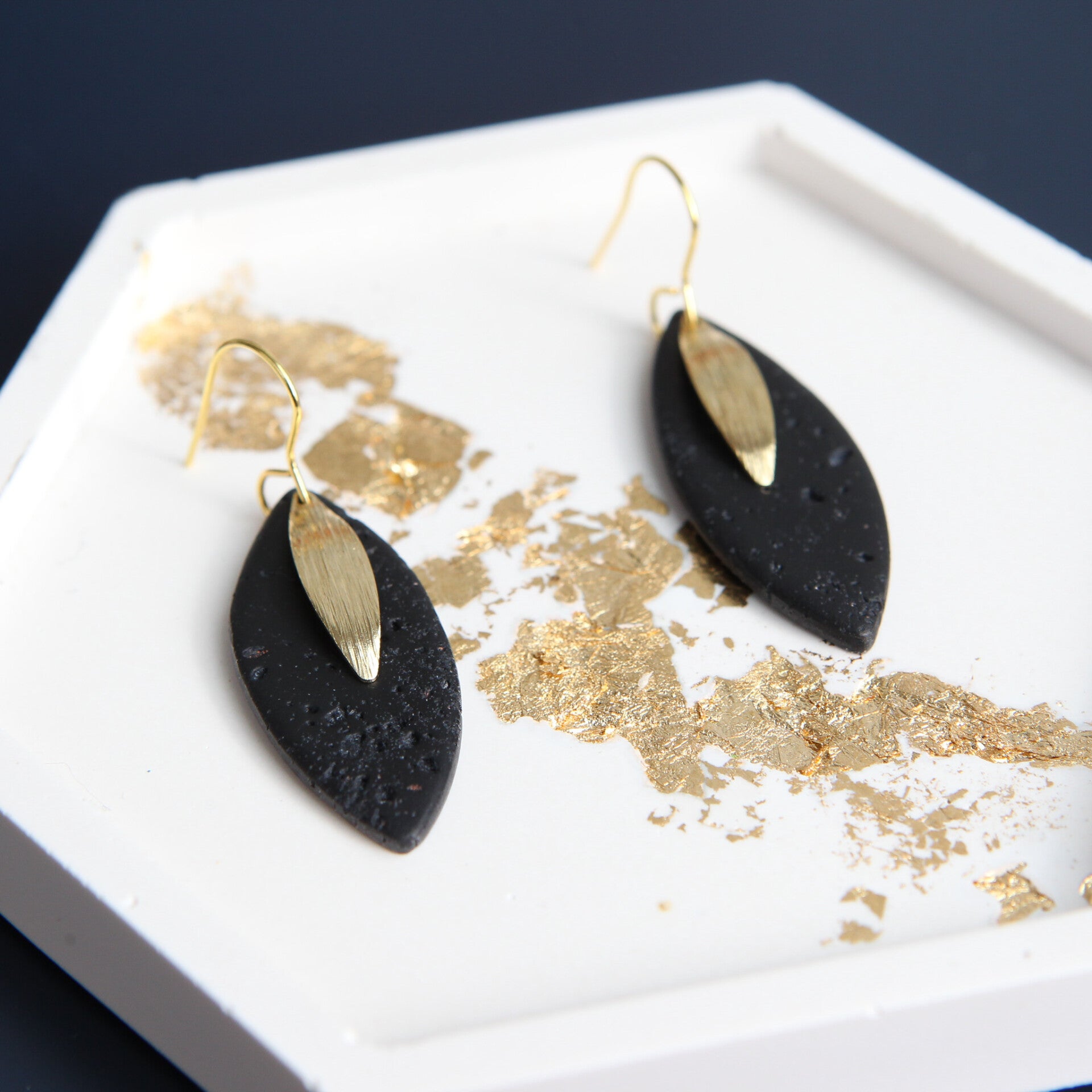 Bladvormige bengelende zwarte oorbellen met een smal messing blaadje