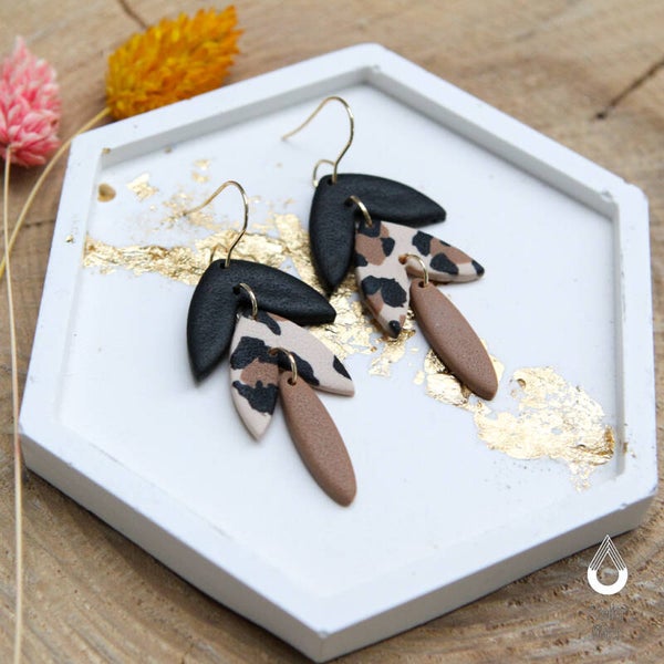 Meerdelige blaadjes oorbellen in zwart, bruin en luipaardprint.