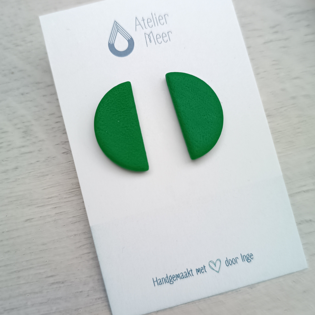 Groene halve cirkel of halve maanvormige oorstekers. Grotere studs voor wie graag kleur wil maar geen grote bengelende oorbellen.