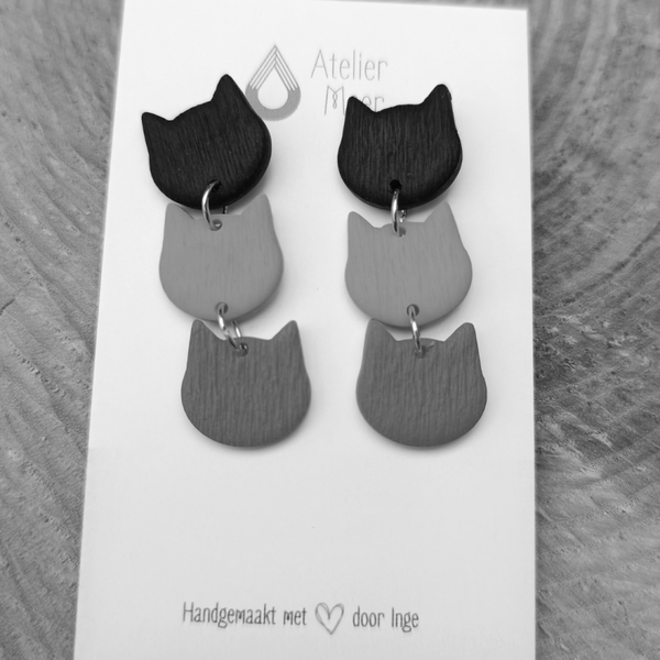 Miauw tripl lange oorbellen ~ poesjes in blauwtinten