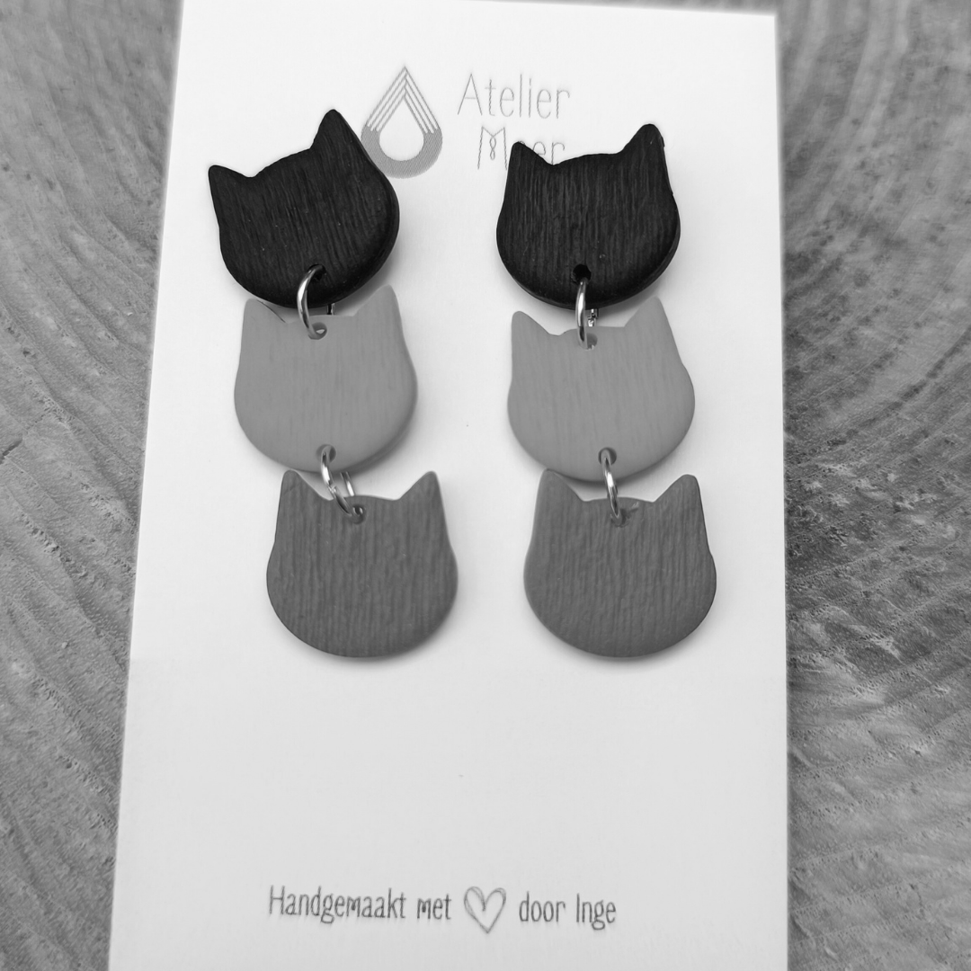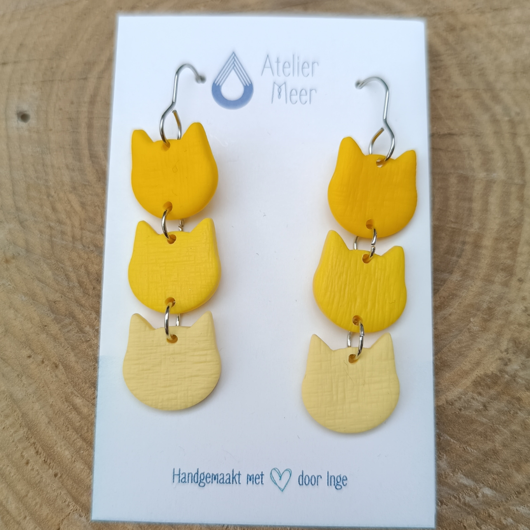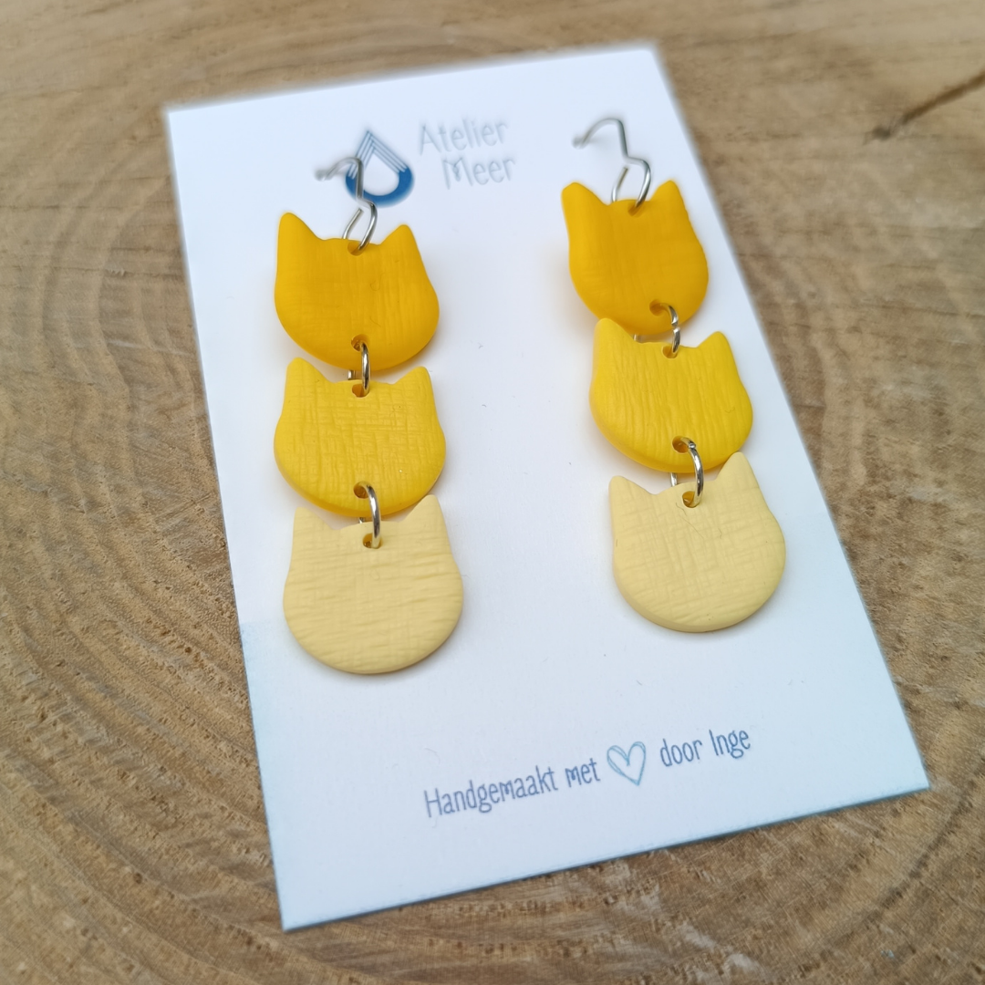 Miauw tripl lange oorbellen ~ poesjes in geeltinten