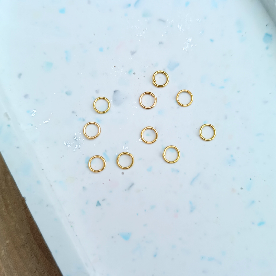 Goudkleurige gesloten jumpring (split ring) om onderdelen van o.a. oorbellen en andere sieraden aan elkaar te bevestigen.