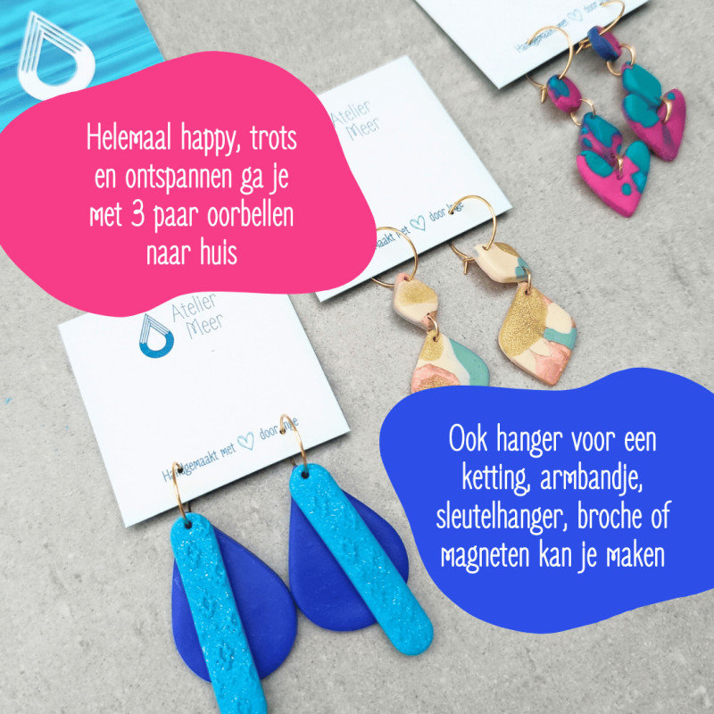 Ik leer je alles over de gebruikte materialen, de werkwijze, geef je tips & tricks terwijl jij 3 paar oorbellen maakt.