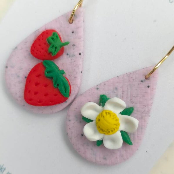 Druppelvormige oorbellen met rode aardbeien en witte aardbeibloem op milkshakeroze achtergrond