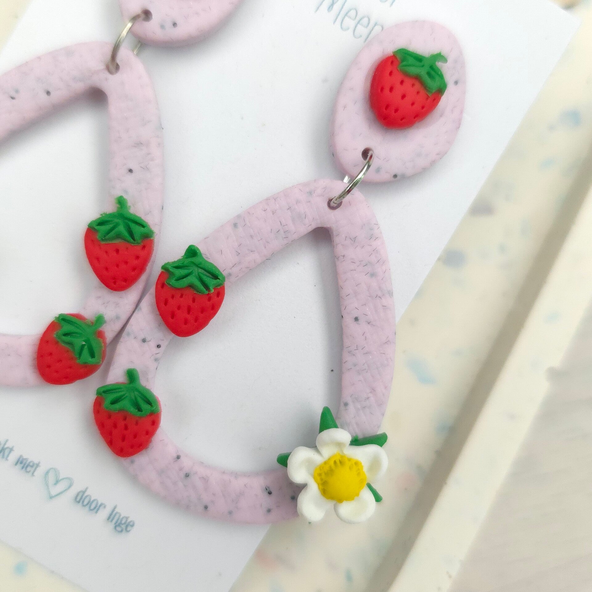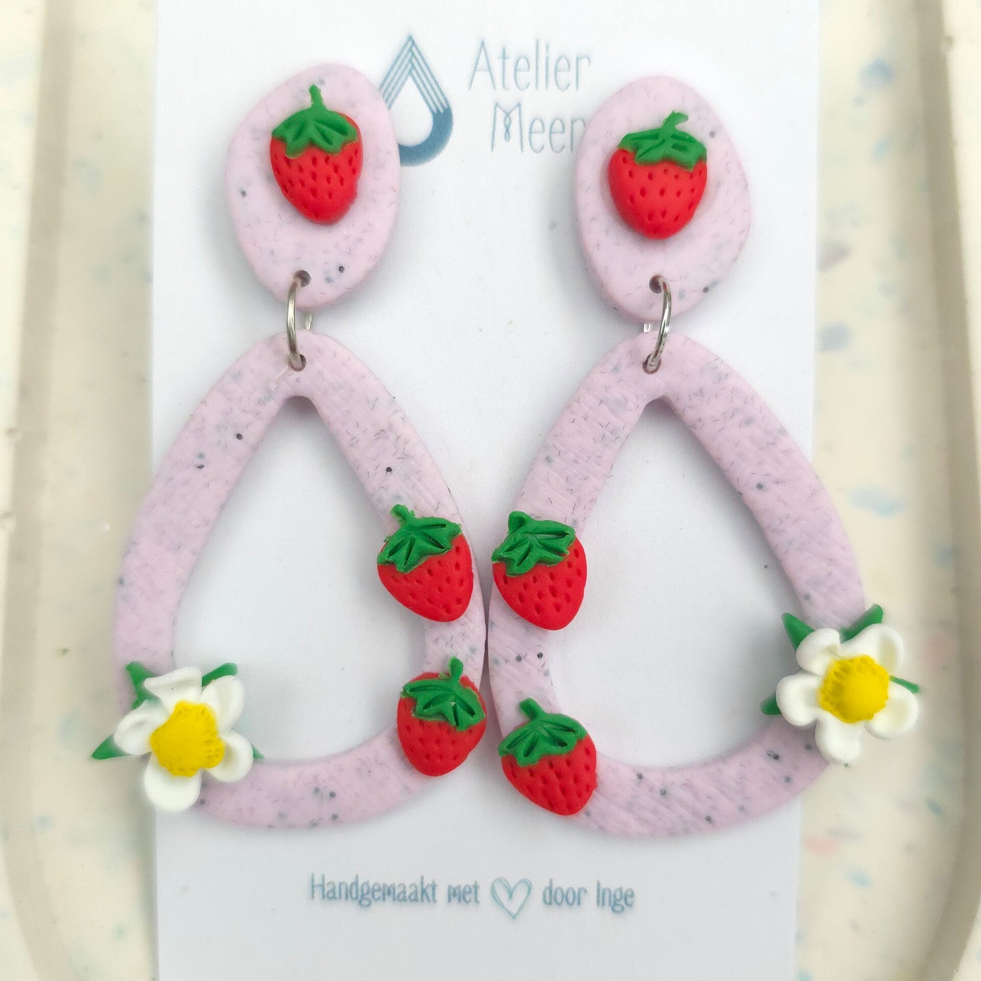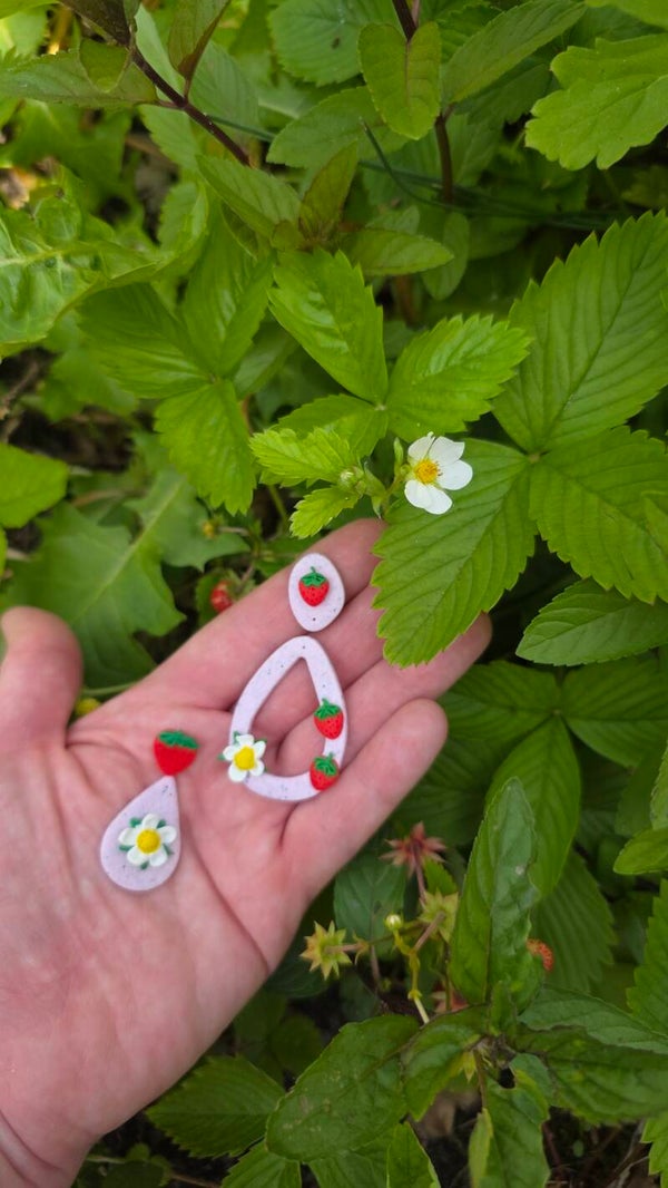 Milkshakeroze holle druppelvormige oorbellen met rode aardbeien en witte aardbeibloem