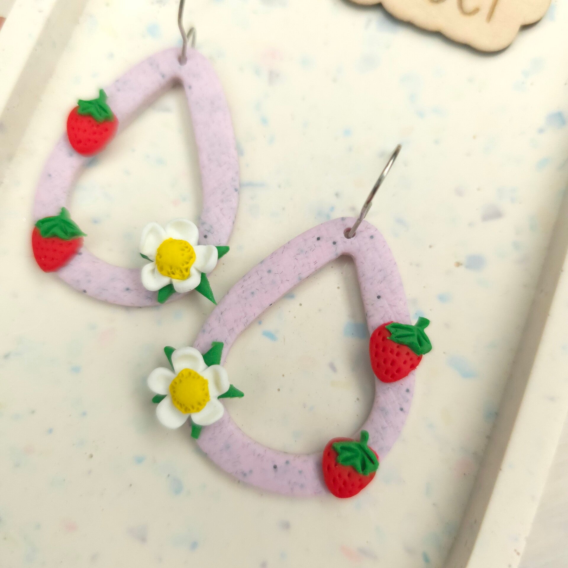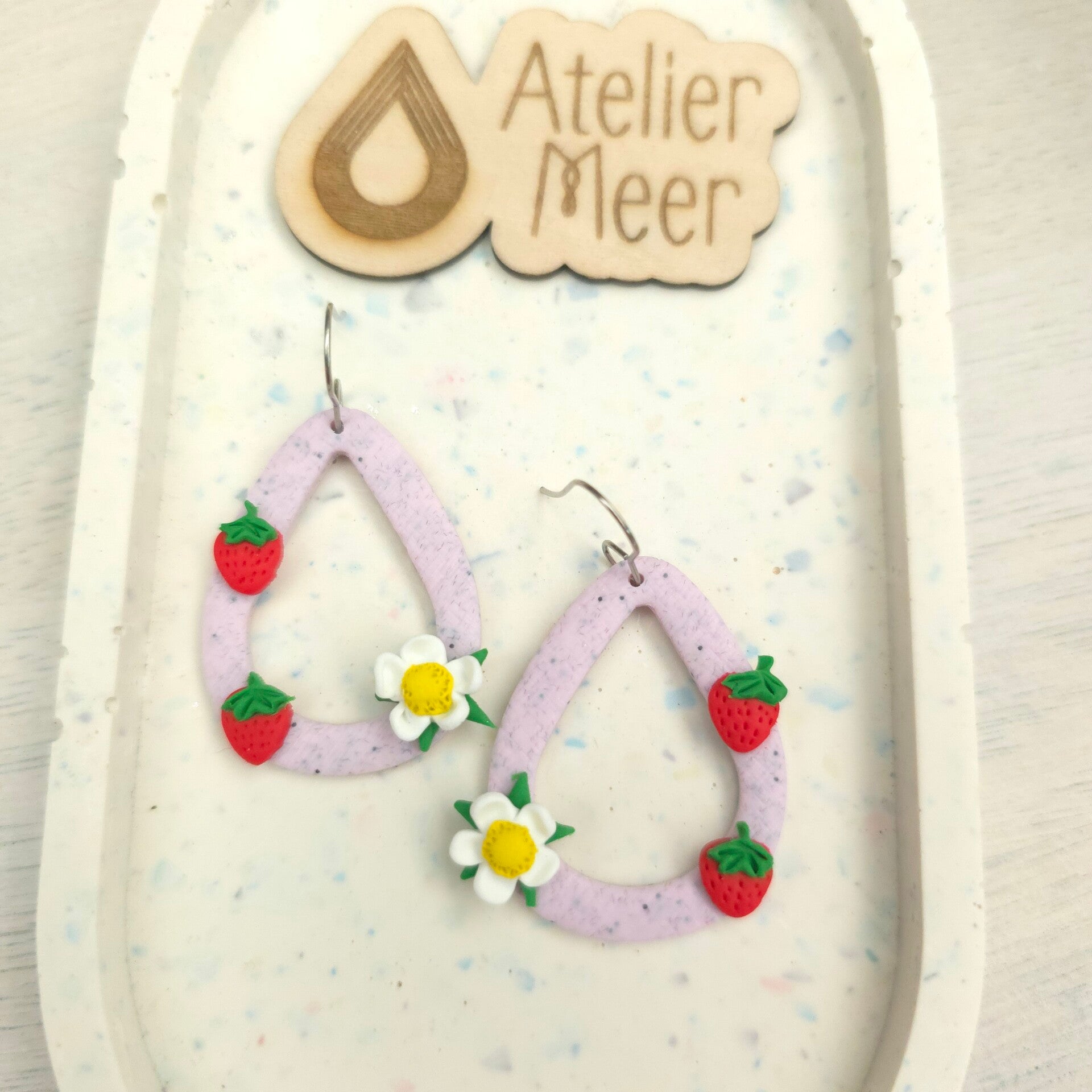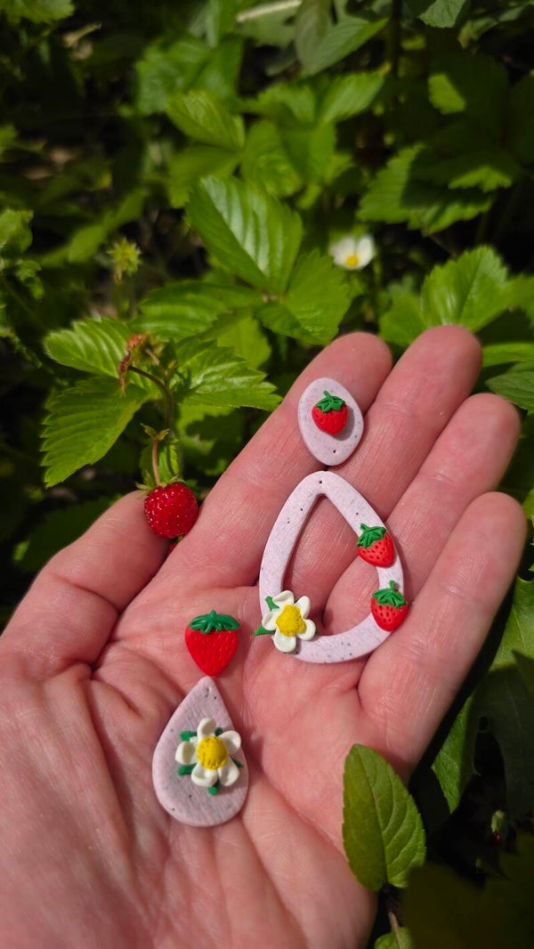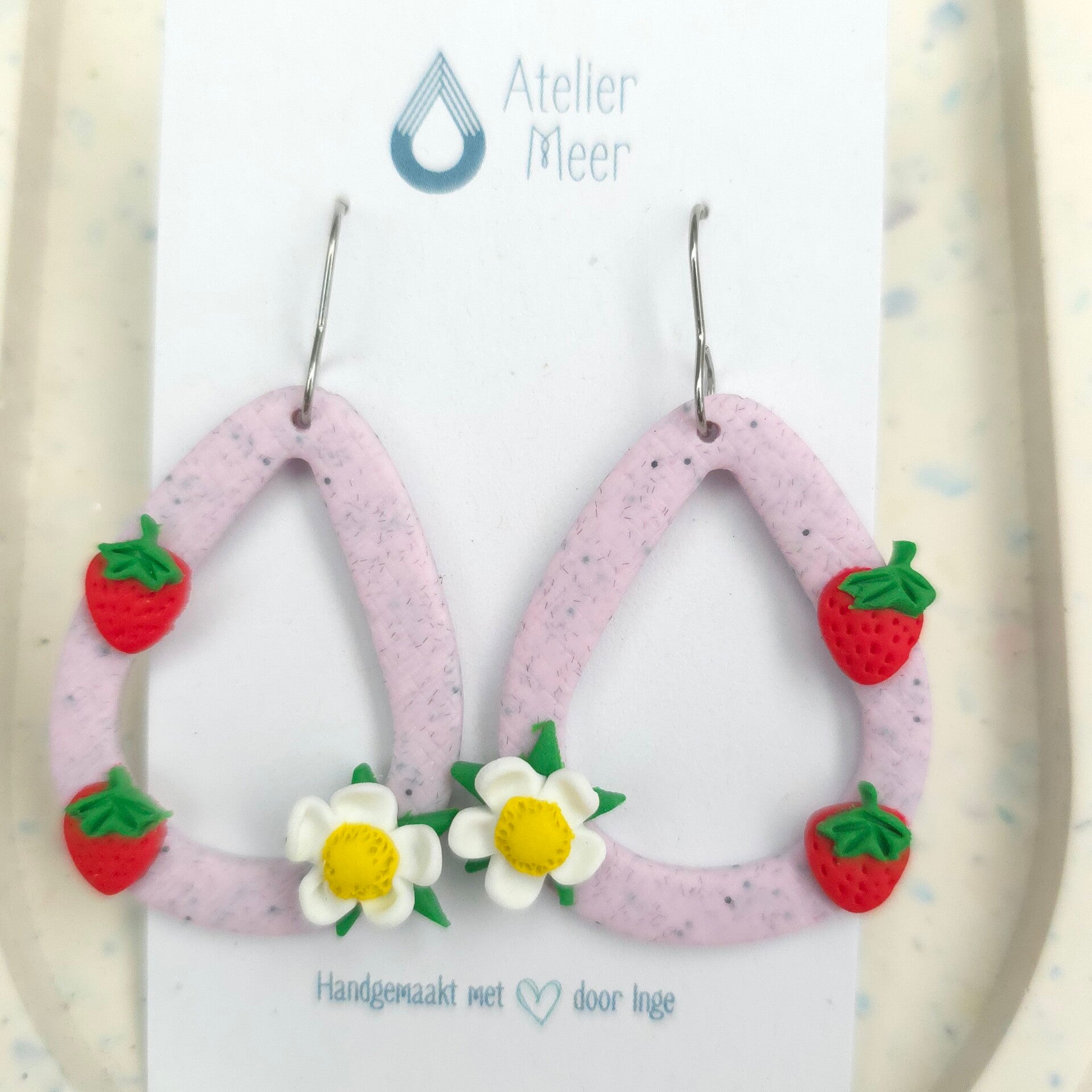 Milkshakeroze holle druppelvormige oorbellen met rode aardbeien en witte aardbeibloem