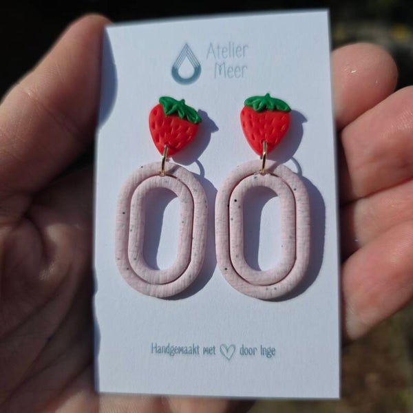 Langegerekte ovalen bengelende oorbellen in polymeerklei in het milkshake roze met een aardbei on top