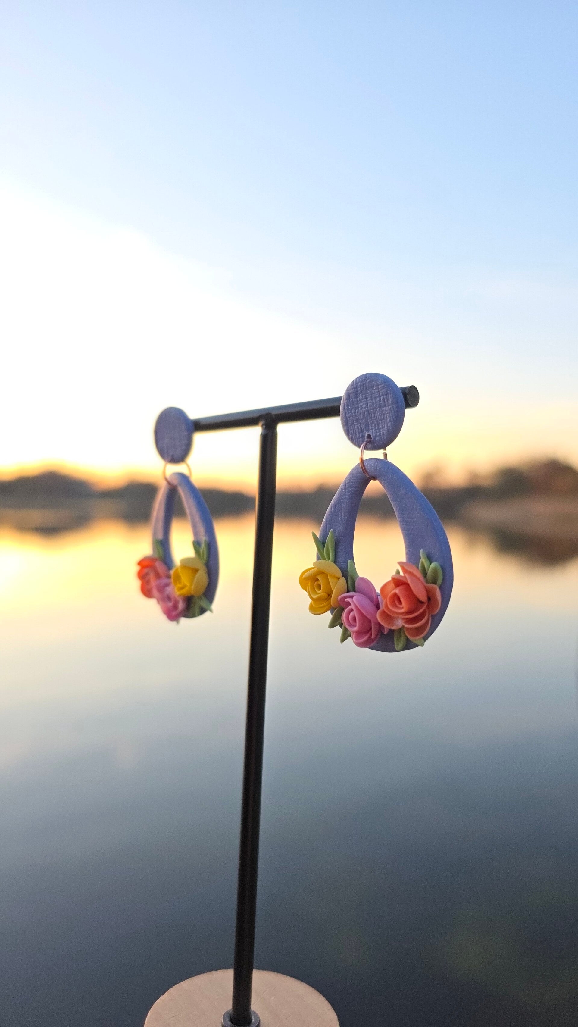 Ontdek de zachte lentekleuren op deze zachtblauwe oorbellen - een delicate creatie van polymeerklei met drie handgemaakte rozen in geel, abrikoos en roze.
