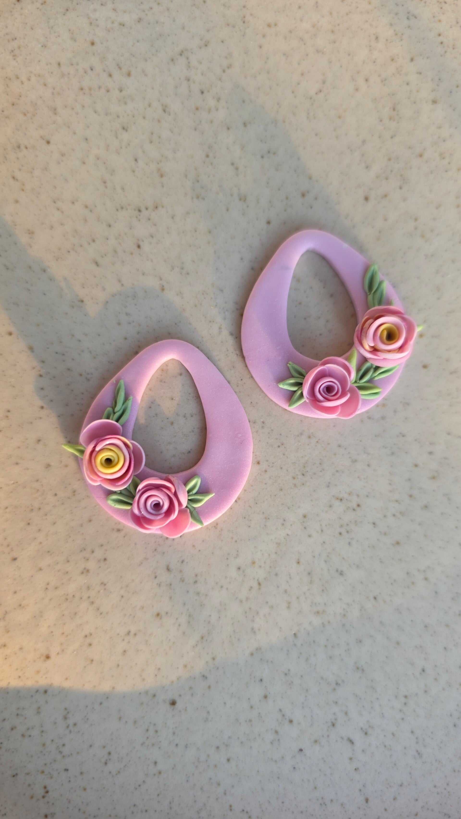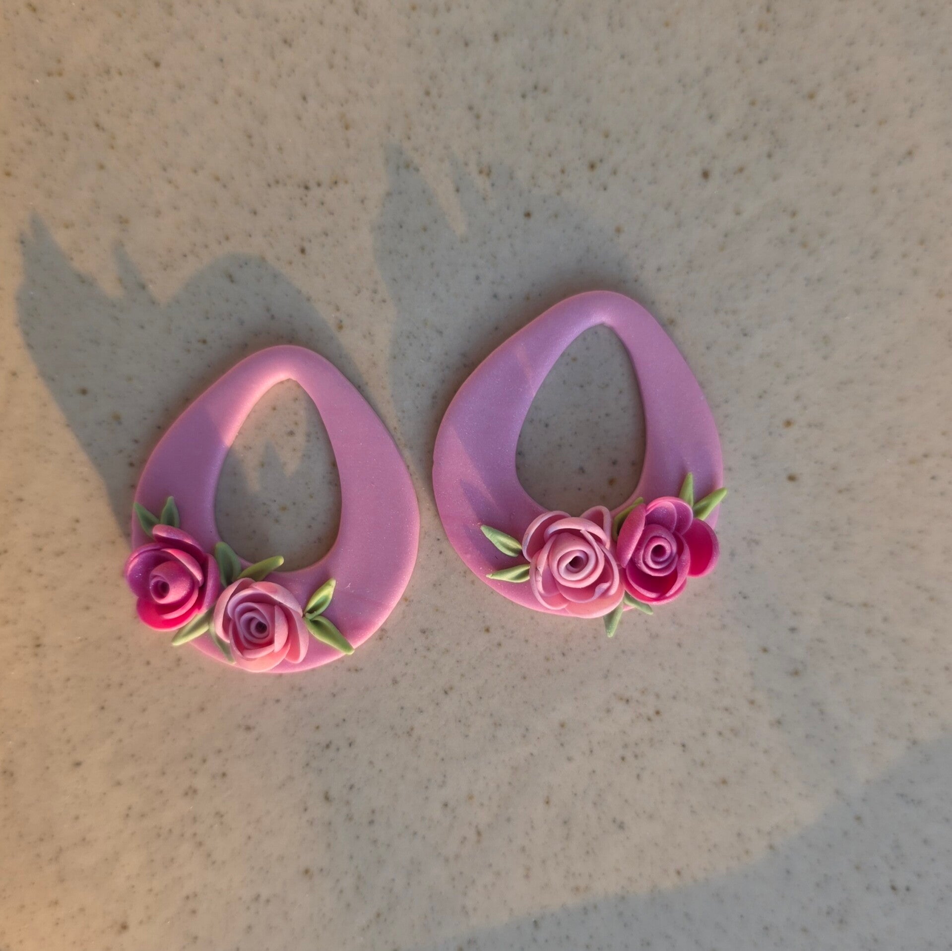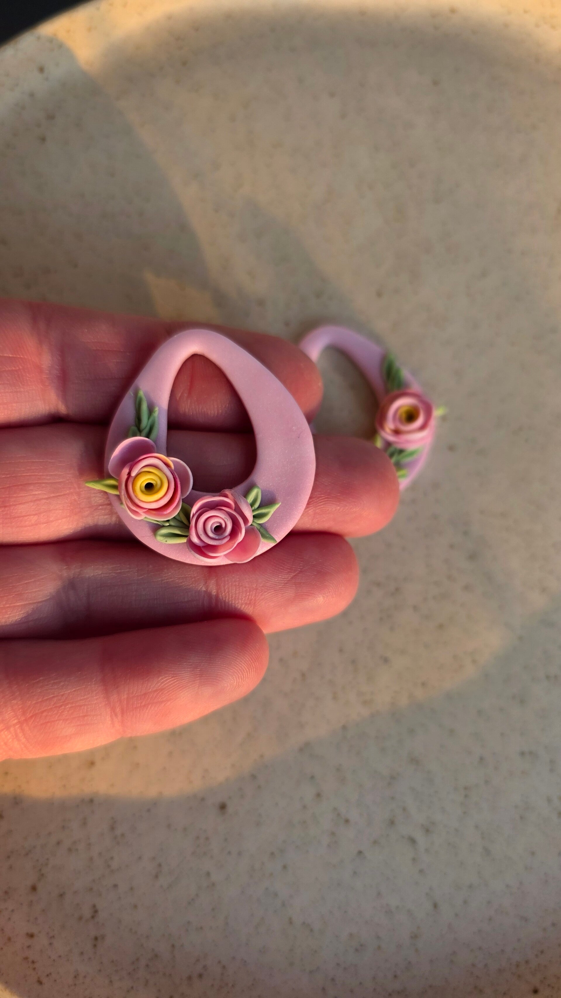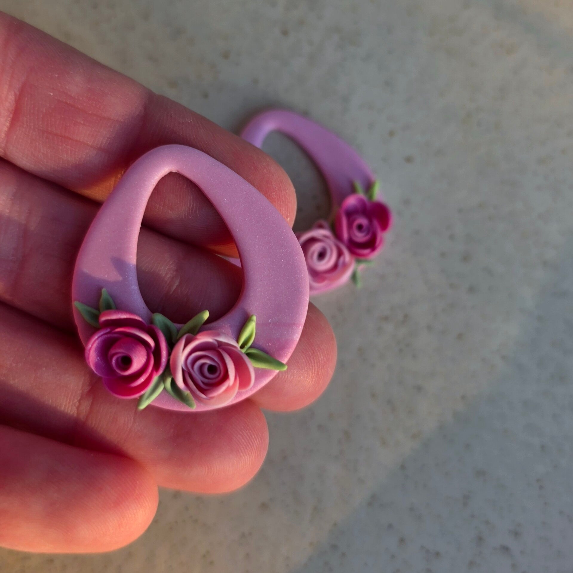 Ontdek de La vie en rose oorbellen - een delicate creatie van polymeerklei met twee handgemaakte rozen in verschillende rozetinten.